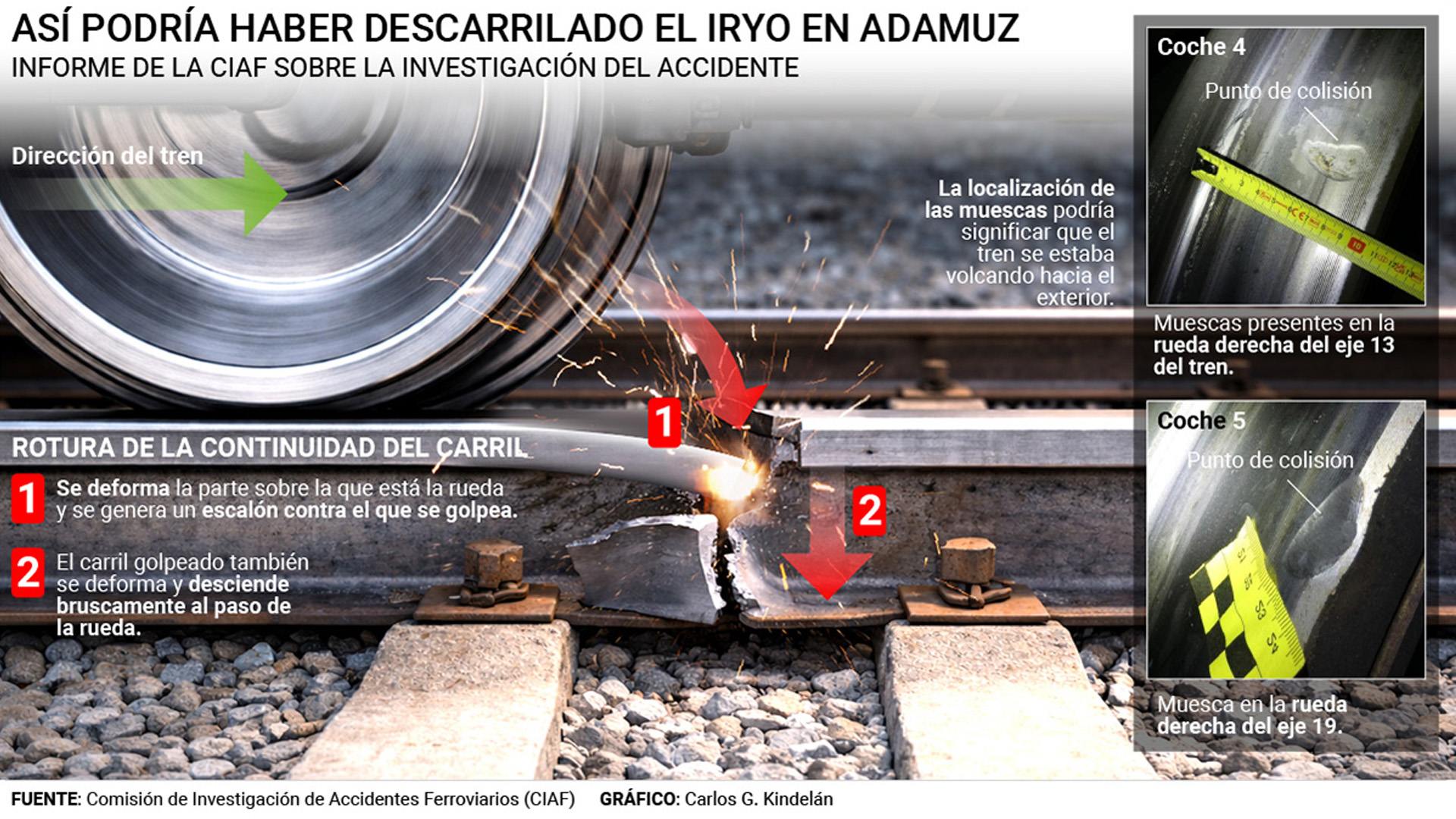 Tras el accidente ferroviario en Adamuz, la Comisión de Investigación de Accidentes Ferroviarios (CIAF) publicó una nota informativa técnica. El documento contenía datos críticos, fotografías forenses de las muescas en las ruedas y un esquema conceptual extremadamente básico sobre la rotura de la vía.